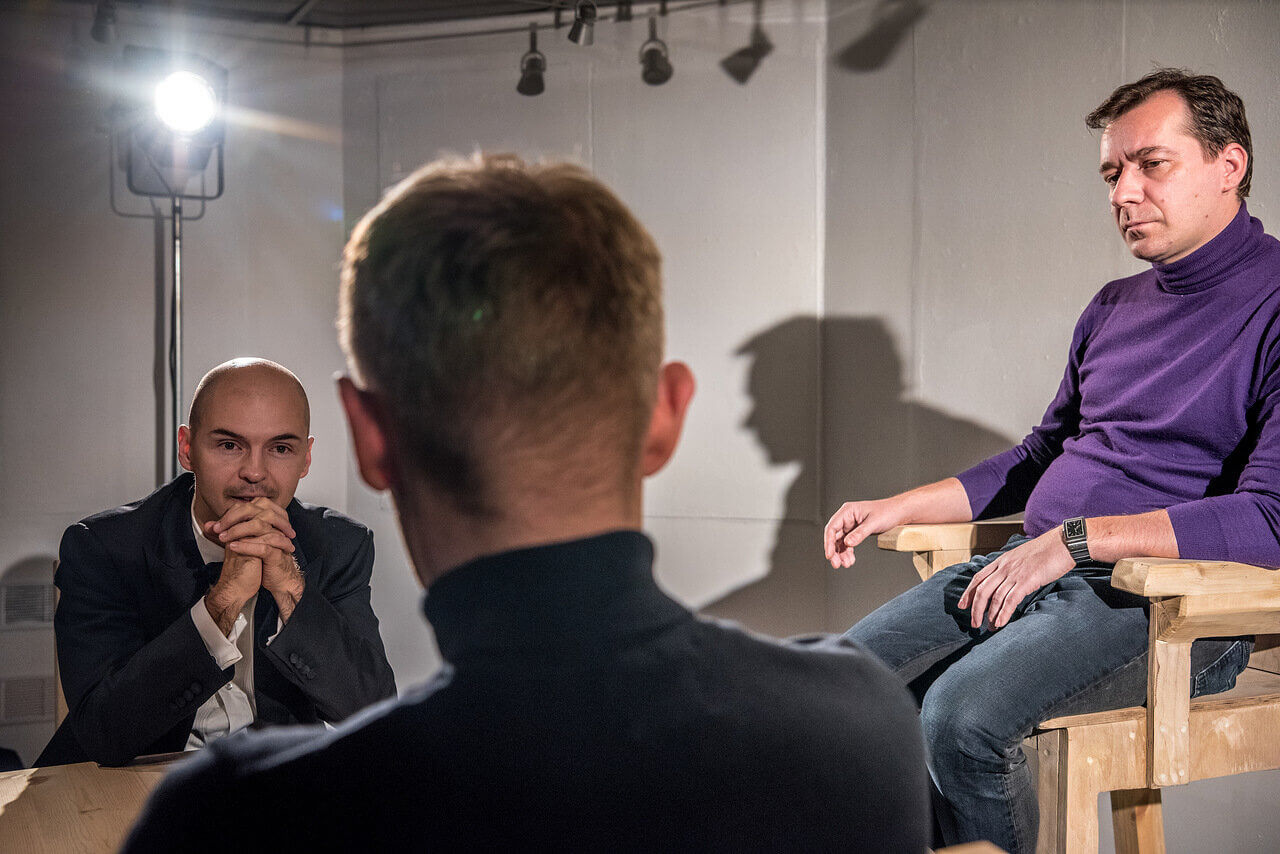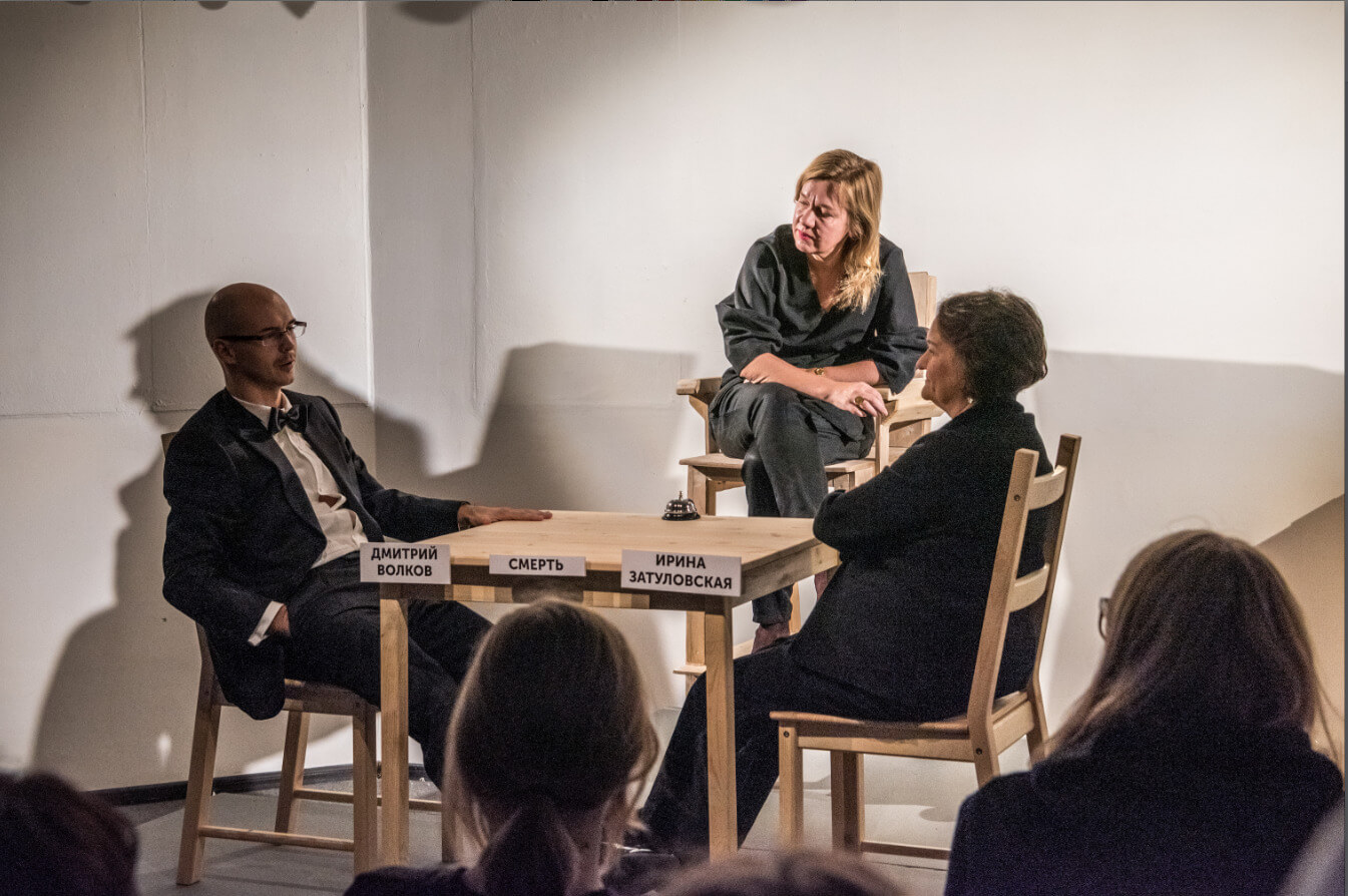 Dmitry Volkov and Artists performance was a part of the Small Button, a project by Fedor Pavlov-Andreevich. It represents a continuous five-hours long dialogue between Dmitry Volkov and artists whose pieces of work gathered in the SDG Arts & Science Foundation collection. This piece of work secret and peculiarity is in the game rules: it is not the participants themselves who control the dialogue but the referees, so that the conversation could not be logical, structured or fruitful, and instead of that it became a piece of living art.